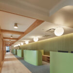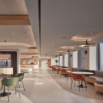 Located in Los Angeles’ Financial District, this new workspace features unique sculptural forms and significant corner views overlooking the city. With the curvilinear concepts playing a key role in the lighting design, the architecture was further enhanced with layers of coves to highlight the rounded soffits and organic-formed decorative fixtures, carefully selected to complement the interior. The goal was to create a warm, welcoming office environment that provided adequate task lighting as well as adding soft illumination on the vertical and horizontal surfaces.