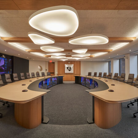 Part of a 14-acre studio campus, this 265,000 sf office spread across two buildings houses the video production space for a streaming media powerhouse. The lighting for the double height feature lobby and green room spaces creates a warm hospitality vibe for their VIP talent. In the Broadcast and Post Production Edit Rooms, multiple layers of lighting with color tuning controls provide flexibility and assists in perceptual color interpretation.